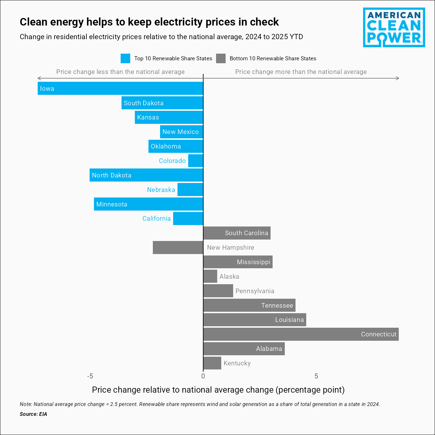 New analysis from ACP shows that states with the highest availability of clean energy resources have seen their electricity prices decline while states with less renewable energy have seen prices increase.